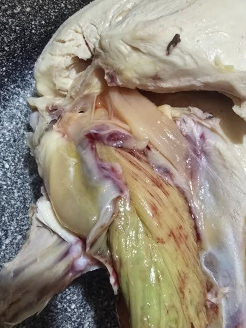 Słaby zielonkawy lub opalizujący połysk na powierzchni mięsa.
