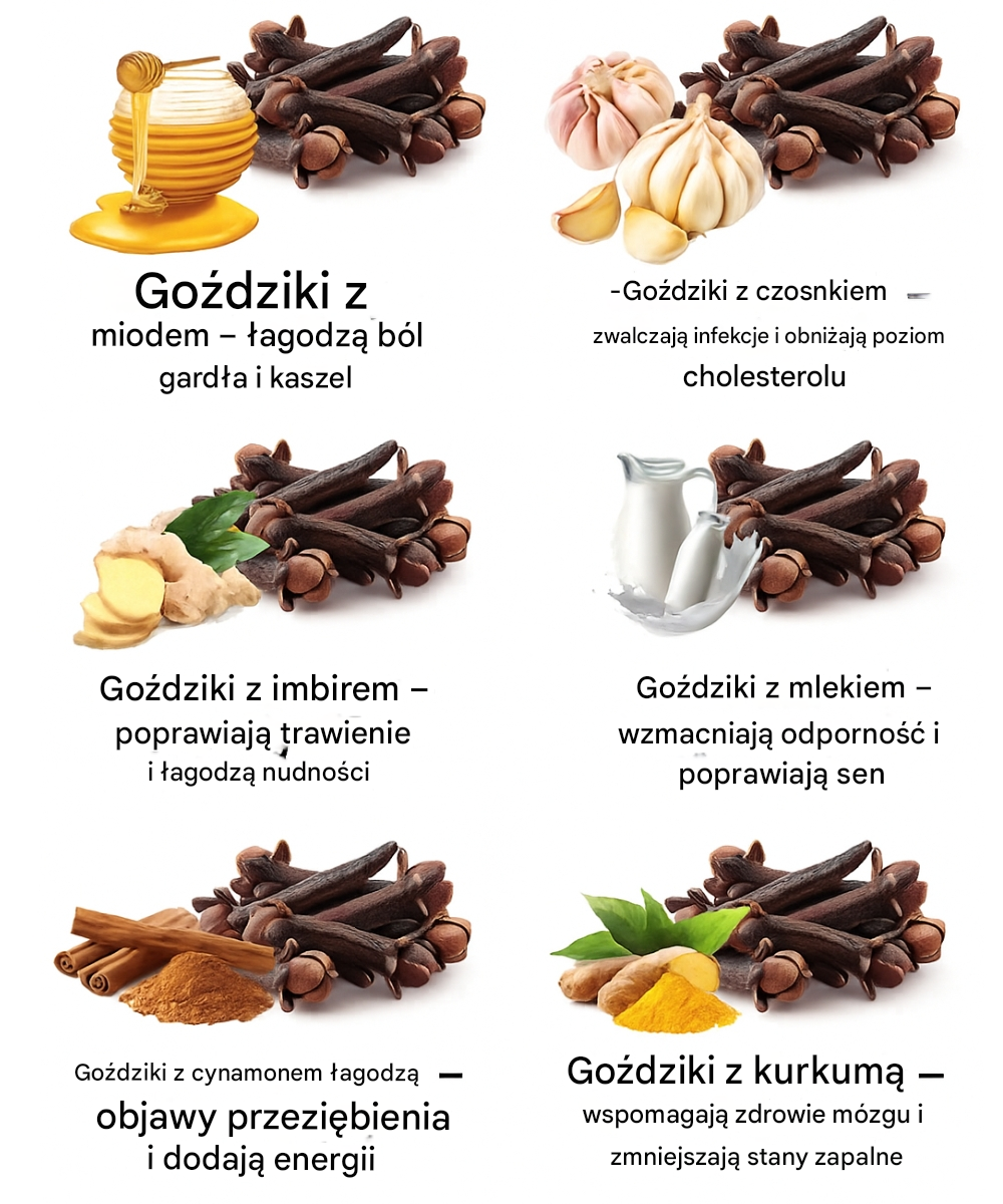 Sposób użycia: Wymieszaj 1 łyżeczkę zmielonych goździków z 2 łyżkami surowego miodu. Zażywaj 1 łyżeczkę 2–3 razy dziennie.