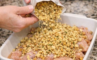 Mama posypuje surowego kurczaka w zapiekance suchą mieszanką farszu. Smakuje o wiele lepiej, niż brzmi.