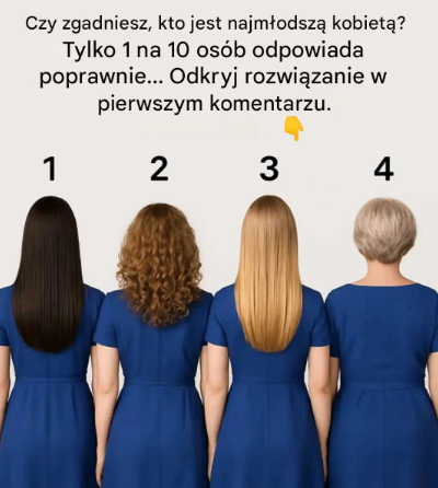 Cztery kobiety, cztery odwrócone plecami, cztery skrajnie różne fryzury… i tylko jedno pytanie: kto jest najmłodszy? Choć na pierwszy rzut oka może się to wydawać proste, uważaj na pozory. Ta wizualna łamigłówka, która zyskała popularność w mediach społecznościowych, sprawdza Twoją zdolność dostrzegania najsubtelniejszych szczegółów.