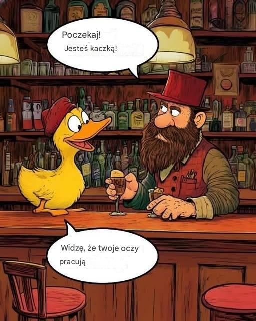 „Rzeczywiście” – a kaczka – „i myślę, że twój słuch też jest dobry. A teraz, jeśli nie masz nic przeciwko, bardzo chętnie napiję się piwa i zjem kanapkę”.