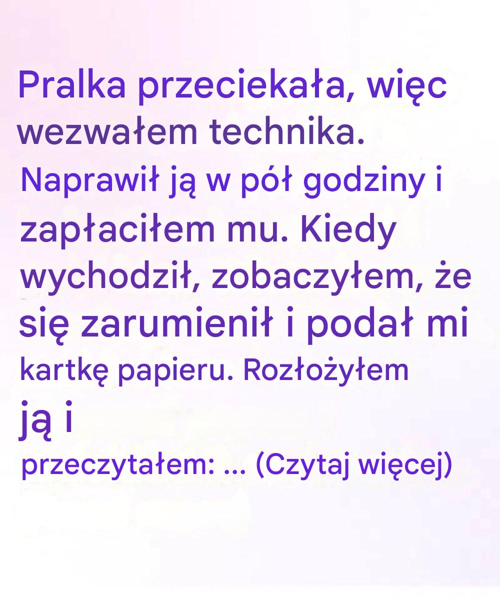 Zaczęło się od czegoś tak zwyczajnego, że ledwo się nad tym zastanowiłem: moja pralka zaczęła przeciekać. Zirytowany, ale pragmatyczny, zadzwoniłem do serwisu. Pojawił się młody technik, błyskawicznie naprawił usterkę i spakował narzędzia. Podziękowałem mu, zapłaciłem i odprowadziłem go do drzwi.