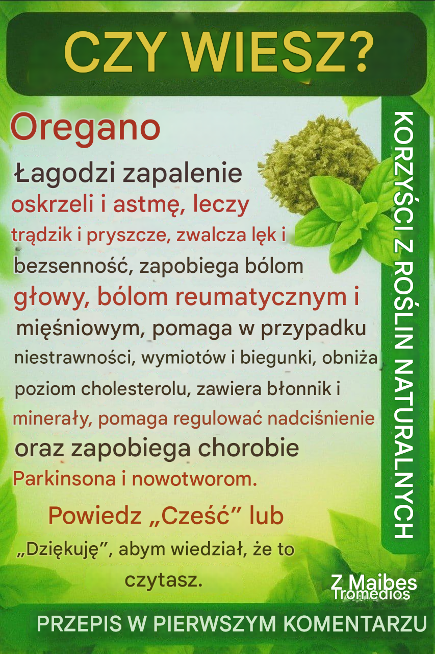Oregano to bardzo popularne zioło aromatyczne w kuchni, ale niewiele osób zdaje sobie sprawę z jego ogromnego potencjału leczniczego. Spożywane w formie naparu, zwłaszcza na pusty żołądek, staje się silnym, naturalnym środkiem oczyszczającym organizm, poprawiającym trawienie, zmniejszającym stany zapalne, zwalczającym infekcje i aktywującym funkcje ważnych narządów, takich jak wątroba i nerki.