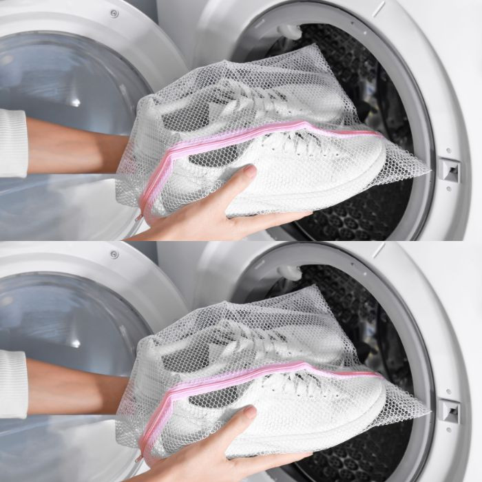 Wróćmy do tematu artykułu! Zdejmij buty i wyjmij sznurowadła oraz wkładki, jeśli są. Następnie usuń najbardziej powierzchniowe zabrudzenia za pomocą gąbki. Teraz umieść je razem ze sznurowadłami w siatce do prania, a następnie w bębnie pralki. Jeśli chcesz złagodzić drgania powstające podczas prania, włóż do pralki ręczniki frotte; eliminują hałas i zmartwienia!
