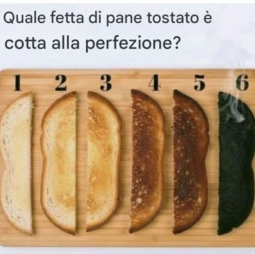 Na pierwszy rzut oka obraz wydaje się prosty: sześć kromek tostu, starannie ułożonych i ponumerowanych od 1 do 6, z których każda reprezentuje inny poziom wysmażenia. Kromka 1 jest lekko opieczona, jasna i miękka, a kromka 6 jest całkowicie spalona, ciemna i dymiąca. Pytanie nad obrazkiem – „Która kromka tostu jest idealnie opieczona?” – wydaje się zabawne, ale jednocześnie skłania do zaskakująco głębokiej refleksji.