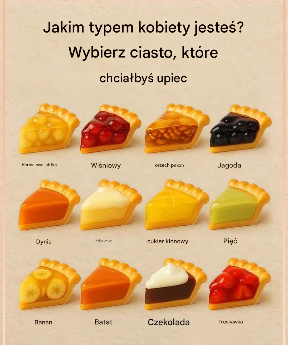 Jedzenie zawsze było czymś więcej niż tylko pożywieniem. To wyraz osobowości, dziedzictwa i nastroju. Piecząc ciasta, wybierane przez nas smaki wiele mówią o tym, kim jesteśmy. Słodkie, cierpkie, kremowe czy pikantne – każde ciasto ma swoją historię. Spójrz na powyższe zdjęcie, wybierz ciasto, które najbardziej chciałabyś upiec, i odkryj, co mówi ono o Twojej kobiecej osobowości.