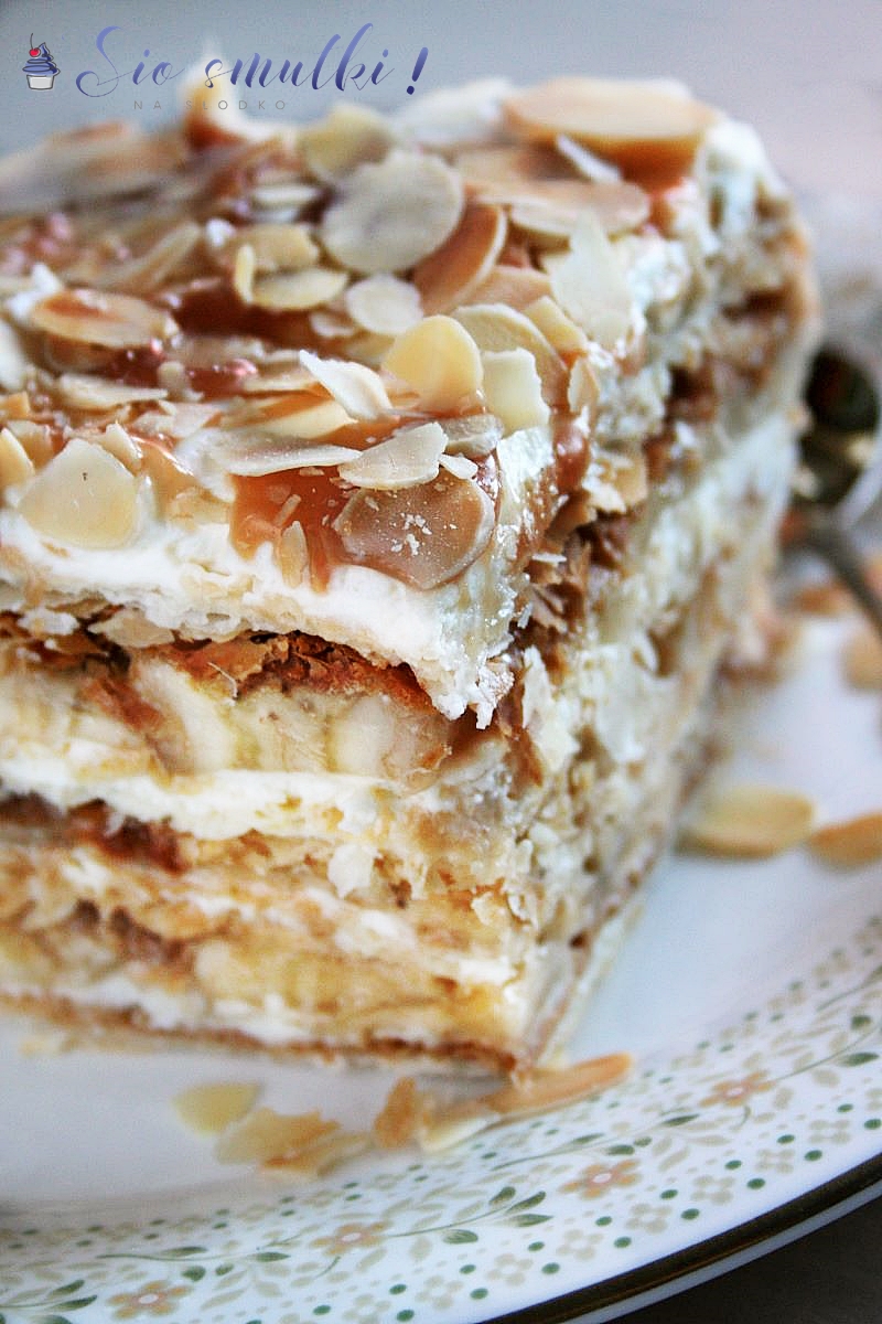 Ciasto, które następnego dnia po zrobieniu cudownie rozpływa się w ustach. Przy czym jest proste do zrobienia, z łatwo dostępnych składników. To blaty z gotowego ciasta francuskiego przełożone kremem z mascarpone i słodkiej śmietanki, z warstwami bananów polanych karmelem. Nie jest przesłodzone, za to mięciutkie i delikatne.