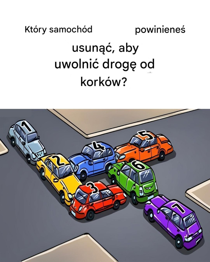 Oto mała wizualna łamigłówka, która wykorzystuje Twoją spostrzegawczość i logiczne myślenie. Cel jest (pozornie) prosty: zidentyfikuj samochód, który należy przesunąć, aby odblokować cały ruch.