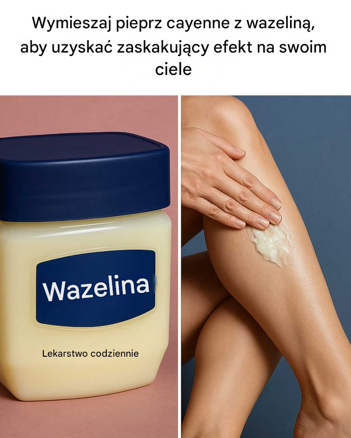 Mieszanka pieprzu cayenne z wazeliną tworzy miejscowy preparat, który może przynieść ulgę w bólu i ochronę skóry. Kapsaicyna zawarta w pieprzu cayenne pobudza krążenie krwi i zapewnia uczucie ciepła, co może pomóc złagodzić bóle mięśni i stawów. Jednocześnie wazelina działa jako nośnik, zapewniając kapsaicynie dłuższe utrzymywanie się na skórze i głębszą penetrację. Ten synergistyczny efekt może wzmocnić właściwości przeciwbólowe pieprzu cayenne, a jednocześnie nawilżać i chronić skórę przed podrażnieniami.