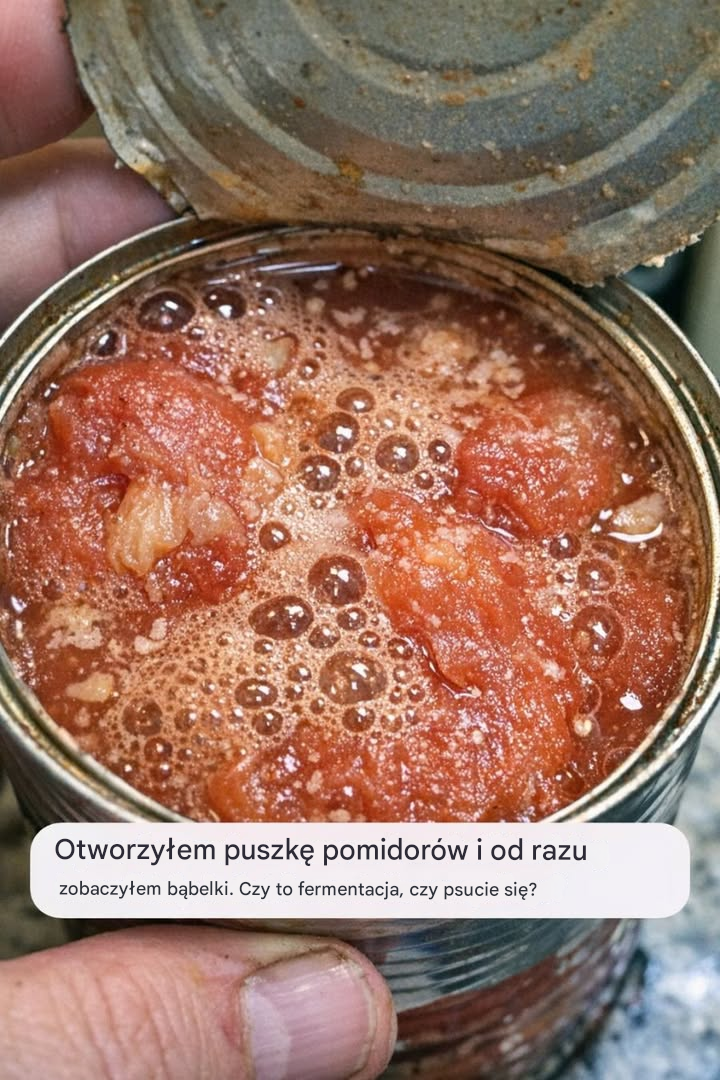 Po otwarciu puszki pomidorów można natychmiast zauważyć unoszące się bąbelki. Często jest to spowodowane uwolnieniem rozpuszczonych gazów, które zostały uwięzione pod ciśnieniem podczas procesu konserwowania. Żywność w puszkach jest szczelnie zamknięta, co może prowadzić do rozpuszczenia gazów w płynie w puszce. Po otwarciu, nagły spadek ciśnienia pozwala tym gazom uciec, tworząc bąbelki.
