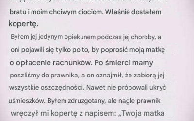 Pewna kobieta opowiedziała historię o swojej matce i darze, jaki po niej zostawiła po śmierci. Kobieta rozpoczęła swoją opowieść od…