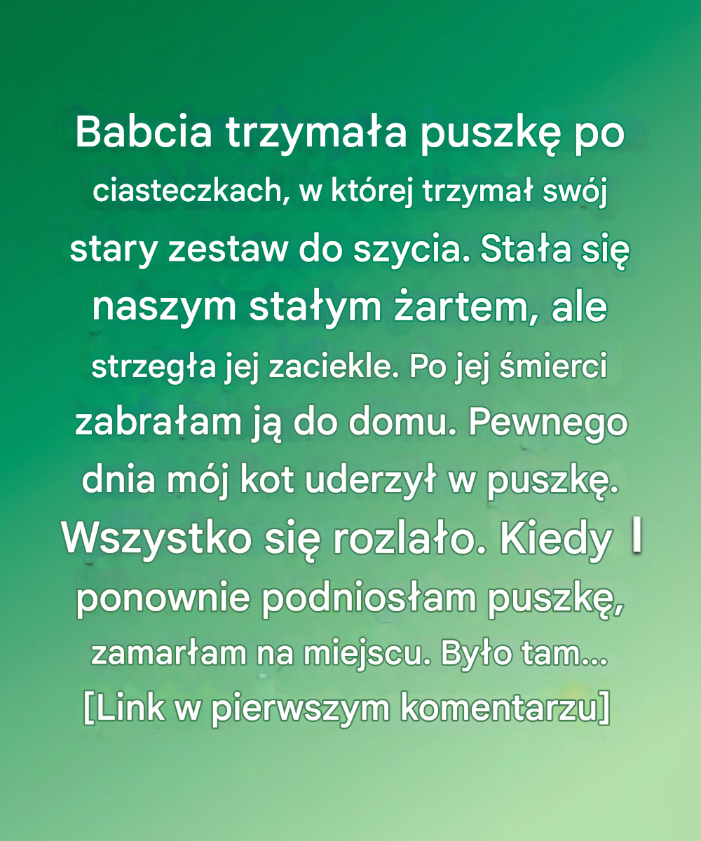 Drażniliśmy ją z tego powodu, gdy byliśmy młodsi. „Pewnego dnia zrobisz nam niespodziankę ciasteczkami, prawda?” – żartowaliśmy. Babcia się uśmiechała, ale nigdy się nie śmiała. Po prostu odkładała puszkę na miejsce, ostrożnie i z rozmysłem. Już jako dziecko czułem, że puszka waży więcej, niż sugerowała jej zawartość. Dla niej to nie było pudełko z drobiazgami. To było coś strzeżonego.