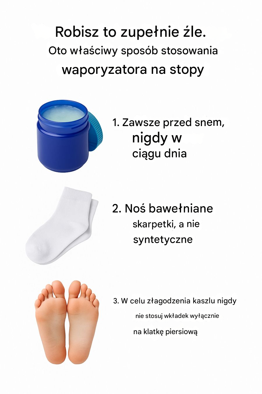 Unikaj materiałów syntetycznych, które mogą zatrzymywać wilgoć i powodować dyskomfort. Oddychająca bawełna zapewnia stopom komfort i suchość, jednocześnie pozwalając maści VapoRub na skuteczne działanie.