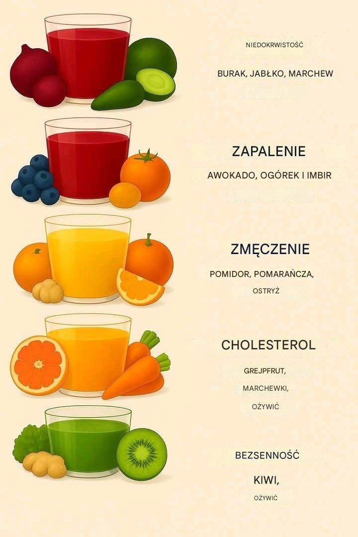 Czy te soki naprawdę mogą złagodzić te dolegliwości? Wyraziste skojarzenia na zdjęciu sugerują korzyści, ale badania naukowe sugerują, że oferują one raczej wsparcie niż cudowne lekarstwo. Buraki mogą pomóc w niedoborze żelaza, imbir w stanach zapalnych, a kiwi w bezsenności, ale znaczące zmiany wymagają czasu i nadzoru lekarza. Ich atrakcyjność tkwi w stopniowej poprawie, jaką mogą przynieść, co zachęca do ostrożnego eksperymentowania.