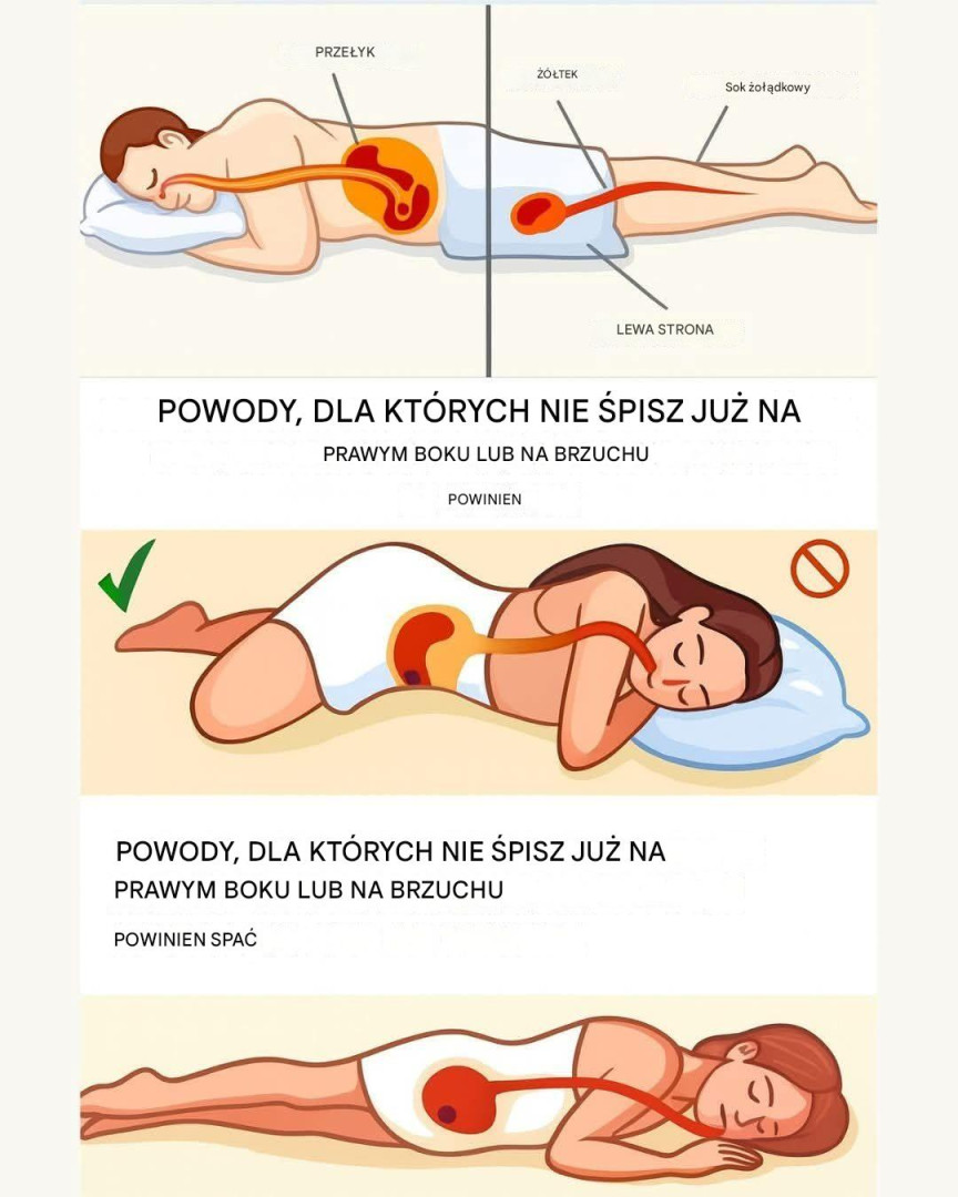 🌀 Z drugiej strony, spanie na plecach lub prawym boku może nasilić refluks żołądkowy, ponieważ w tej pozycji żołądek znajduje się wyżej niż przełyk.