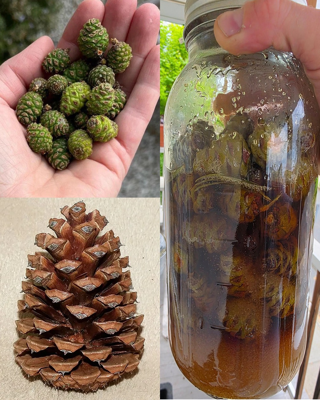 Syrop z szyszek sosnowych to tradycyjny, domowy syrop wytwarzany z niedojrzałych, miękkich szyszek sosnowych (takich, które można pokroić nożem lub łatwo ucisnąć palcami). Szyszki uwalniają aromatyczne związki, łagodną goryczkę i naturalny barwnik, tworząc syrop o smaku leśnego miodu.