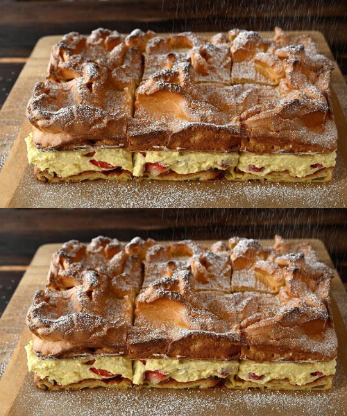 Udekorować pozostałymi truskawkami i posypać cukrem pudrem.