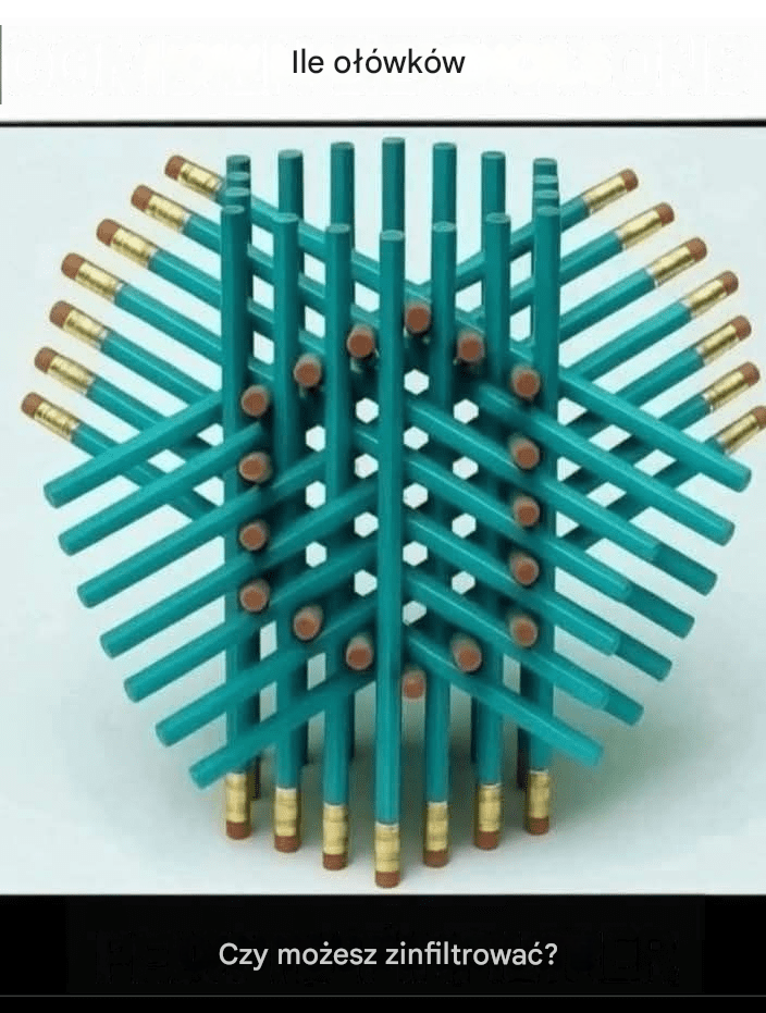Ołówki są ułożone w kratkę, co sprawia, że ich liczenie jest zaskakująco trudne. Niektóre wydają się na siebie nachodzić, inne znikają za strukturą, a nietypowy układ tworzy iluzję, że jest ich więcej niż w rzeczywistości.