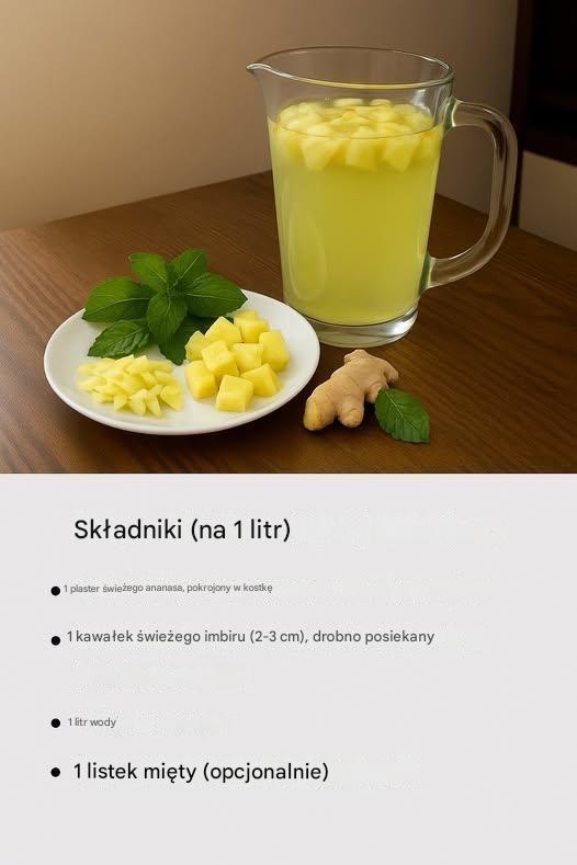 Dodanie wody: Do dużego szklanego dzbanka włóż kawałki ananasa i starty imbir do 1 litra letniej wody.