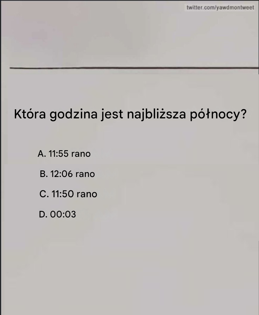 Co więcej, sformułowanie pytania zachęcało uczestników do kreatywności. Zapytanie, które zostało wyświetlone ponad 1,4 miliona razy, oferowało cztery opcje: A. 11:55, B. 12:06, C. 11:50 i D. 12:03. Wielu użytkowników wydawało się zdezorientowanych i udzielało różnych odpowiedzi w komentarzach.