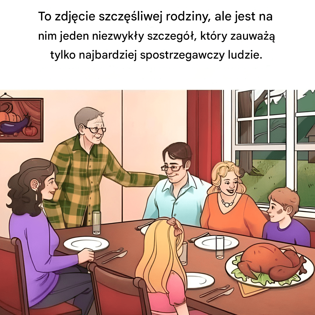 Uwielbiamy te małe wizualne łamigłówki, które sprawiają, że marszczymy brwi, mrużymy oczy i nagle mówimy: „Ależ oczywiście!”, gdy znajdziemy rozwiązanie. Ta ma w sobie to coś, co pobudza umysł i rozbudza ciekawość. Wyobraź sobie: rodzina zebrana na posiłku, ciepła atmosfera, duży indyk na środku stołu… Wszystko wydaje się normalne. A jednak jeden szczegół nie pasuje. Czy potrafisz go znaleźć?