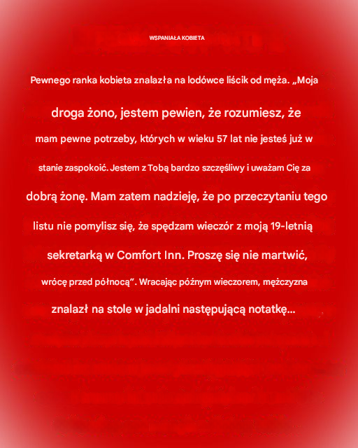 Ach, jaka zuchwałość! Ale poczekajcie, aż zobaczycie reakcję naszej 57-letniej bohaterki. Kiedy Pan Gładki Operator wraca późnym wieczorem do domu, prawdopodobnie zadowolony z siebie, znajduje kolejną notatkę, tym razem na stole w jadalni, a na niej: