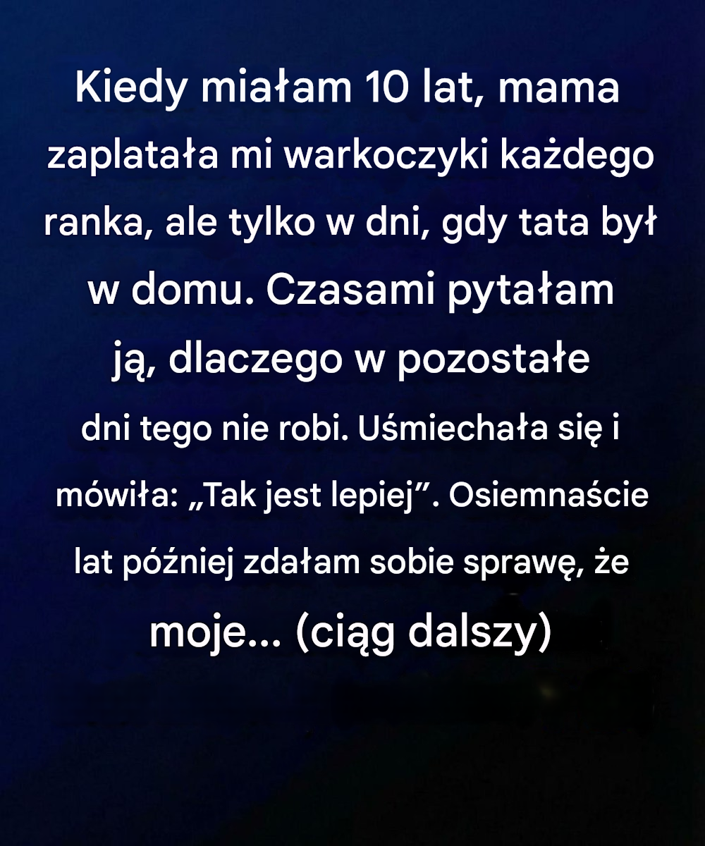 Czasami zastanawiałem się, dlaczego w inne poranki tego unikała. Kiedy zapytałem, uśmiechnęła się delikatnie i odpowiedziała: „Tak jest łatwiej”. Wtedy przyjąłem to jako jedną z tych niejasnych odpowiedzi dorosłych, z którymi dzieci się nie spierają. Nie przywiązywałem do tego większej wagi. Po prostu cieszyłem się delikatnym ruchem jej dłoni, spokojnym początkiem dnia i poczuciem, że życie w naszym małym domku jest dokładnie takie, jakie być powinno.