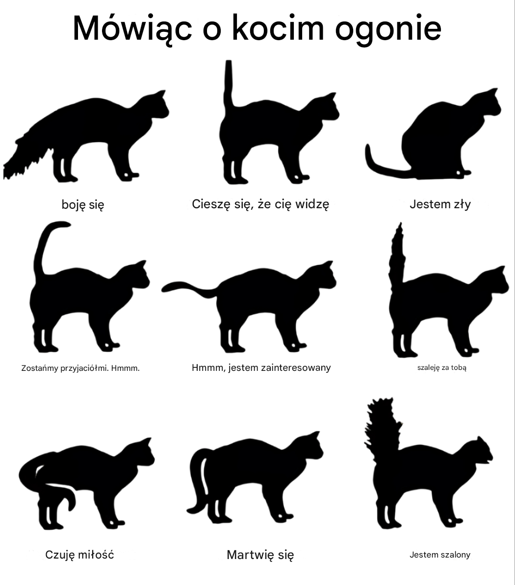 Zrozumienie języka kociego ogona: Mapa kocich emocji przetłumaczona na podstawie ich ogonów! Ogon trzymany prosto : Nastrój: Szczęśliwy, pewny siebie. Twój kot czuje się bezpiecznie, towarzysko i cieszy się na twój widok. Ogon podwinięty lub zahaczony na końcu : Nastrój: Przyjazny, ciekawy . Oznaka zabawnego i zrelaksowanego nastroju. Idealny moment na interakcję. Ogon podwinięty między nogi : Nastrój: Strachliwy, uległy . Twój kot jest niespokojny lub przestraszony. Zapewnij mu cichą przestrzeń. Biczowanie lub uderzanie ogonem w powietrze : Nastrój: Zirytowany, zły. Wyraźne ostrzeżenie: jest zirytowany lub nadmiernie pobudzony. Odsuń się. Ogon najeżony jak szczotka : Nastrój: Przerażony lub agresywny![]()